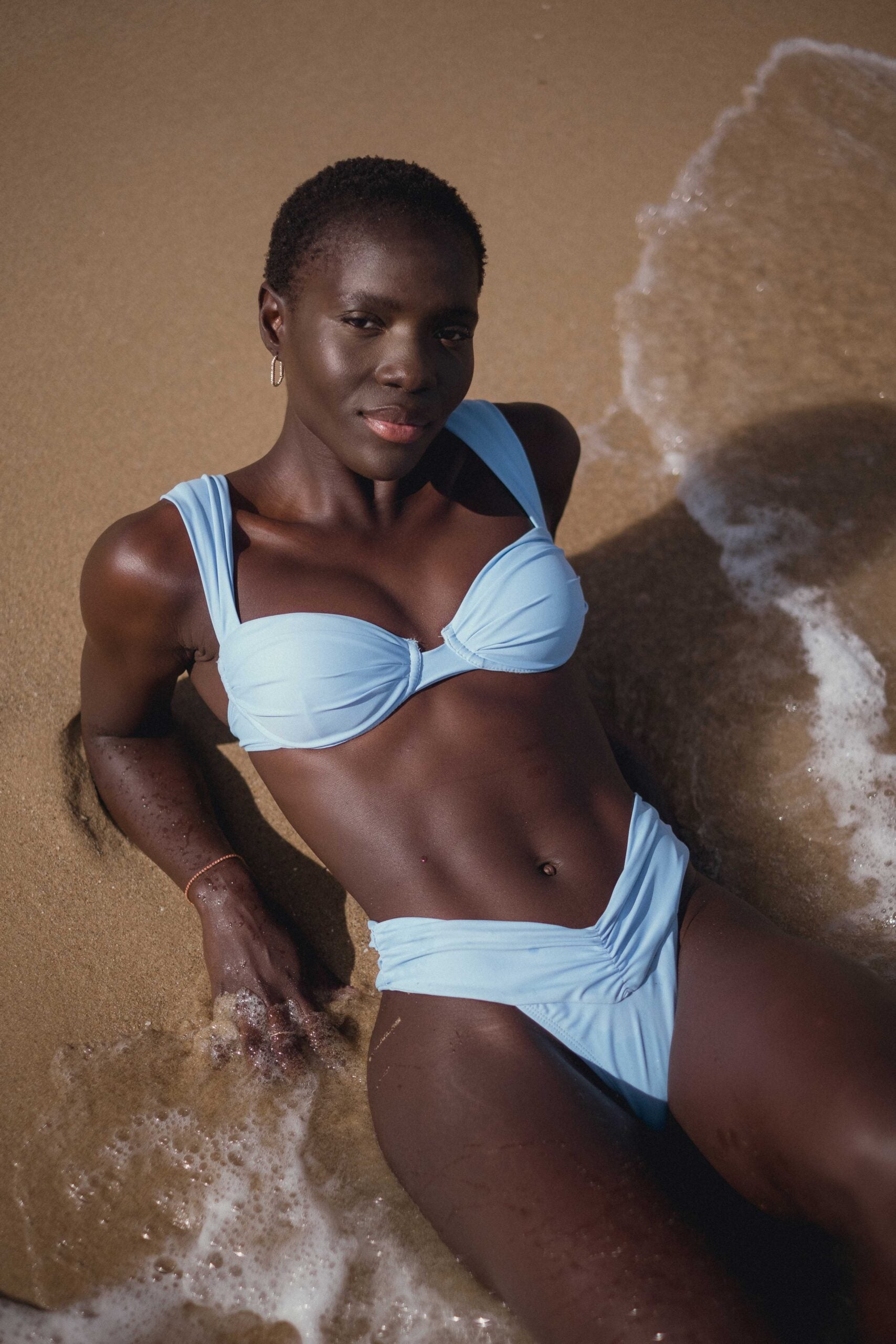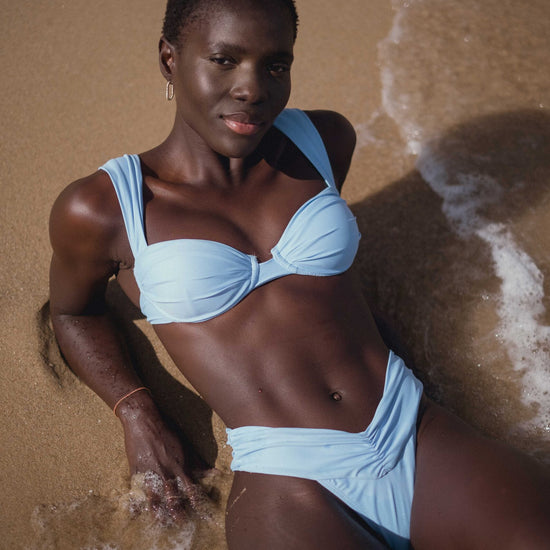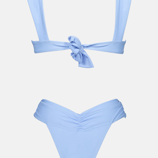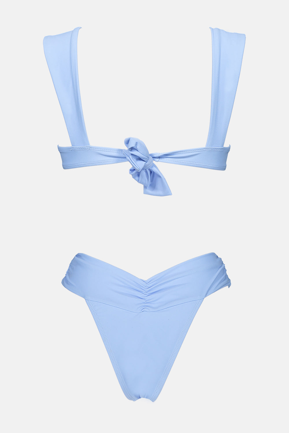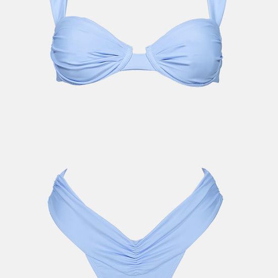 Wrinkled bikini set with handles size detail. Underwire top that offers comfort and great support. "V" cut briefs that enhance any kind of silhouette. The model wears size "S".